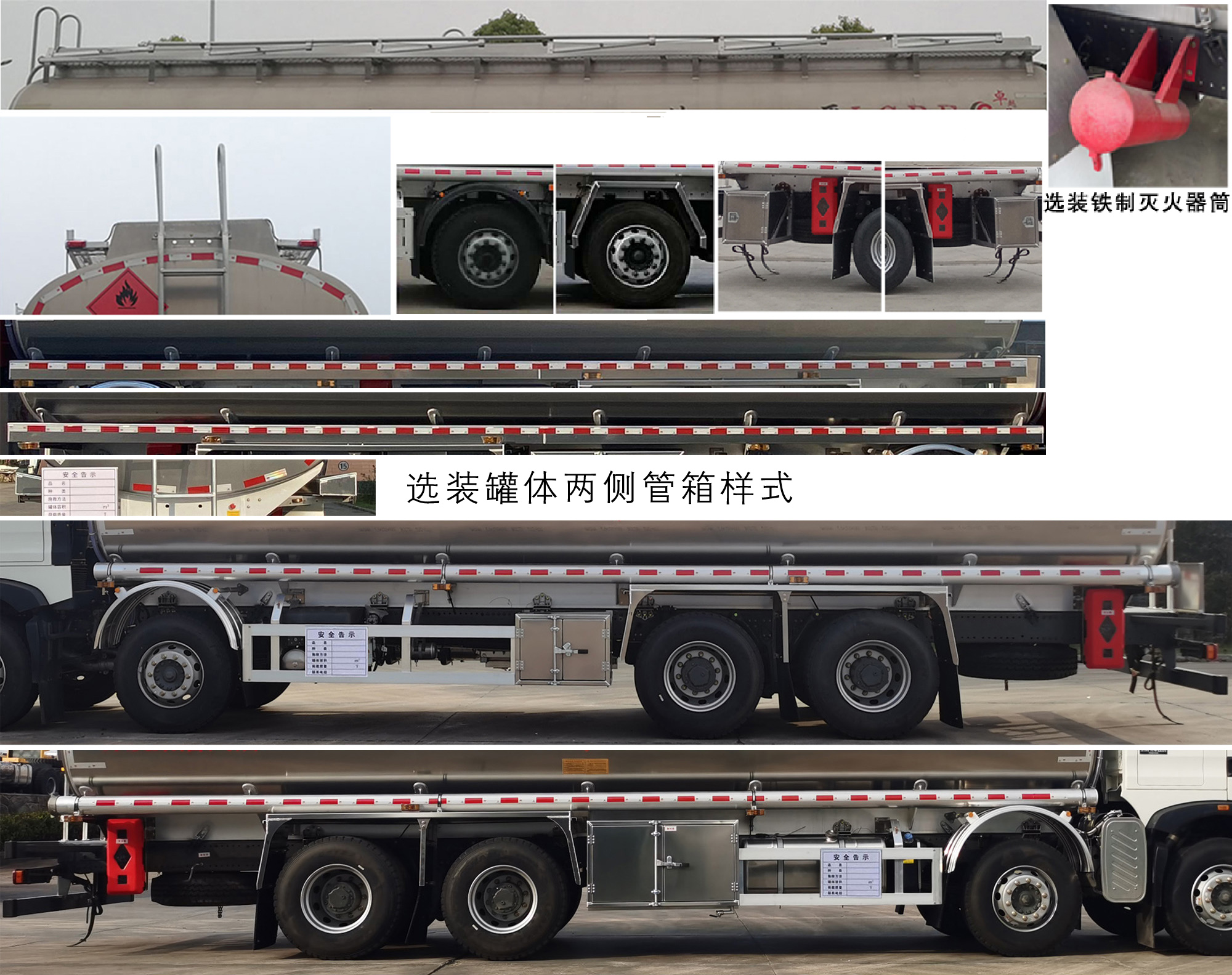 其它:該車(chē)適用于危險(xiǎn)品運(yùn)輸,運(yùn)送危險(xiǎn)貨物車(chē)輛類(lèi)型為:FL型.準(zhǔn)運(yùn)介質(zhì)最大密度:830千克/立方米,罐體總?cè)萘?4.8立方米,罐體有效容積24.1立方米,罐體外形尺寸(長(zhǎng)×寬×高)(mm):9200×2200×1500.僅采用軸距(mm):1800+4575+1400,1950+4600+1400的底盤(pán)改裝.側(cè)防護(hù)材料為鋁合金,螺栓連接;后防護(hù)材料為Q235,螺栓連接,截面尺寸(mm)80×140,下邊緣離地高500mm.僅選用排氣管前置、限速裝置(限速80km/h)、前輪盤(pán)式制動(dòng)及子午線輪胎的底盤(pán),轉(zhuǎn)向輪安裝輪胎爆胎應(yīng)急防護(hù)裝置,后軸采用空氣懸架,安裝帶有衛(wèi)星定位功能的行駛記錄儀.EBS型號(hào)/生產(chǎn)廠家:EBS3/威伯科(上海)管理有限公司.發(fā)動(dòng)機(jī)/油耗申報(bào)值(L/100km)對(duì)應(yīng)關(guān)系為:MC11.43-61/36.70,MC11.44-60/37.12,MC07H.33-60/37.44,MC09.35B-60/38.01,MC09.35-60/38.30,MC07.31-60/38.13,MC07.34-60/38.13,WP10H400E62/36.40,MC07H.35-60/37.44,MC09.38-60/38.30,MC07.33-60/38.13,WP9H350E62/36.39,MC11.40-60/37.12,MC11.40-61/36.70,WP8.350E61/35.68,MC11.46-61/36.70,MC11H.46-61/38.01,WP10.5H430E62/37.99,WP12.430E62/37.42,WP12.490E62/37.42,WP12.460E62/37.42.該車(chē)可選裝直接供電式ETC車(chē)載裝置.隨底盤(pán)選裝駕駛室,選裝鋁合金輪轂,選裝尿素箱、電瓶箱、儲(chǔ)氣筒、后處理安裝位置。罐體上部選裝上走道,第二軸選裝弧形膠制擋泥板或方形擋泥板,選裝左右側(cè)后部工具箱及左側(cè)工具箱樣式,選裝鐵制滅火器筒,選裝罐體兩側(cè)管箱樣式.
