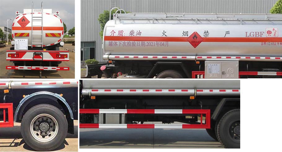 | 配置 | 1、該車適用于危險品運輸,運送危險貨物車輛類型為:FL型,類項號:3。罐體有效容積:12.65立方米,運輸介質(zhì):柴油、煤油、汽油,密度:830、800、700千克/立方米,罐體外形尺寸(長×寬×高)(mm):5700×2000×1400。罐體上部選裝上走道;選裝后部尾燈架樣式;選裝弧形擋泥板;選裝左側(cè)無工具箱。加油機型號及生產(chǎn)企業(yè):BL1111Z/珠海市貝林加油設(shè)備有限公司中山分公司,HS1812B/托肯恒山科技(廣州)有限公司,SKES-1112/恒和嘉華科技有限公司(上海伯萊機械有限公司),SK20QF-111A、SK20QF-222A/鄭州三金石油設(shè)備制造有限公司,CS20D1110F/正星科技有限公司,JSK-70B1121CZ,JSK-70B1121C,JSK45B1121C/穩(wěn)恩佳力佳(北京)石油化工設(shè)備有限公司, ZH6444/佛山市眾澤機電科技有限公司, XTST121BF1/邢臺正潤通科技發(fā)展有限公司,TA-1111KFJ/沈陽航天新陽機電有限公司。2、側(cè),后防護材料均為Q235,螺栓連接;后防護截面尺寸120×60mm,下邊緣離地高500mm。3、僅采用軸距(mm):4700。隨底盤選裝駕駛室前面罩,選裝側(cè)窗玻璃;駕駛室頂部中間三個裝飾燈為選裝件;前霧燈為選裝件;駕駛室前臉擾流罩為選裝件。僅選用排氣管前置、限速裝置(限速80km/h)、前輪盤式制動及子午線輪胎的底盤;安裝帶有衛(wèi)星定位功能的行駛記錄儀;后軸采用空氣懸架,轉(zhuǎn)向輪安裝輪胎爆胎應(yīng)急防護裝置。ABS型號/生產(chǎn)廠家:3631010-C2000/東科克諾爾商用車制動系統(tǒng)(十堰)有限公司。 | ||